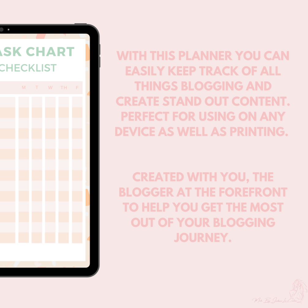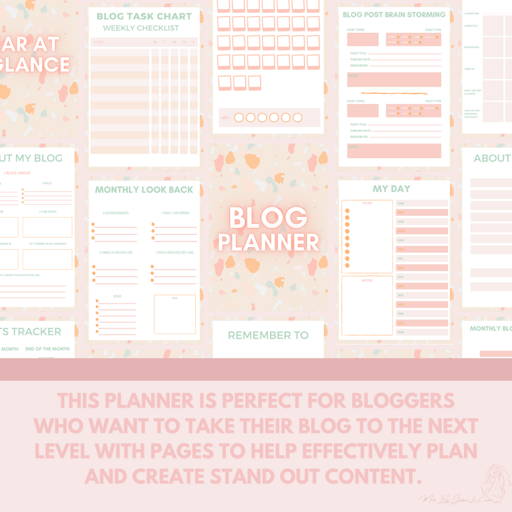 Take charge of your blogging journey today; stay organised with the monthly, weekly and daily sections, optimise your blog post performance with the planning stages section, get your creative juices flowing with a brain storming session and get ready to take your blogging performance to the next level.