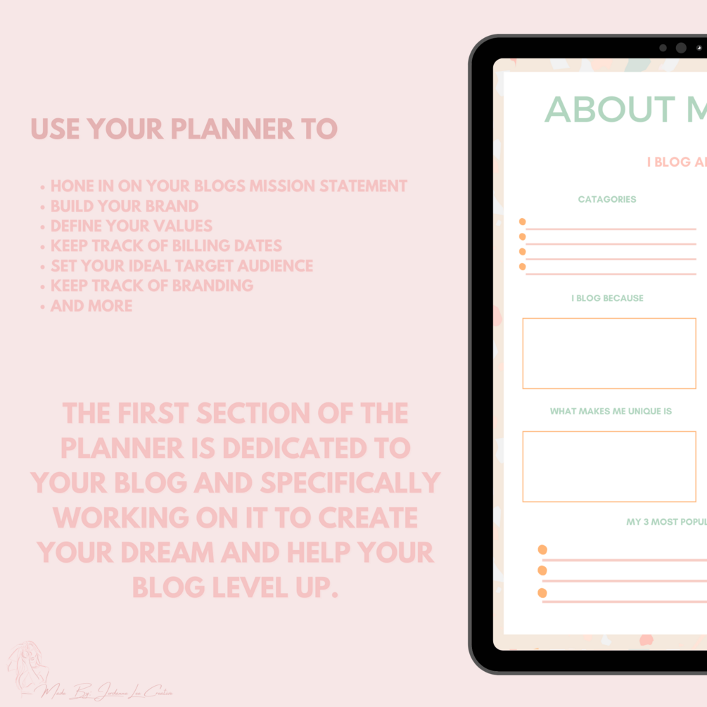 No part of this Blog planner may be reproduced, in any form without written permission from Jordanneleecreative. This blog planner is for personal/business use only. It may not be reproduced, copied or sold.