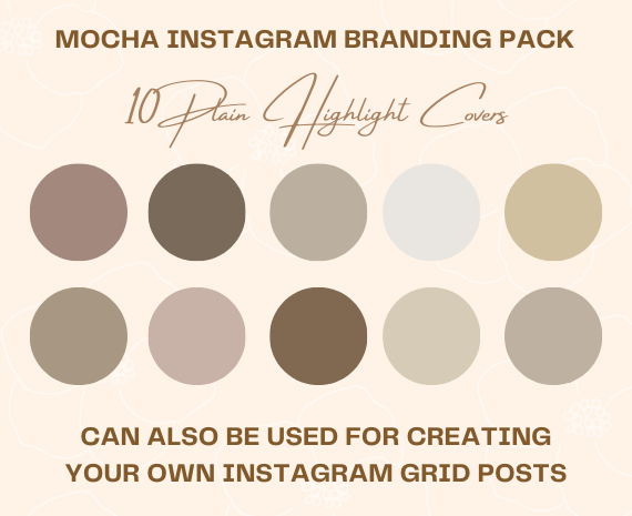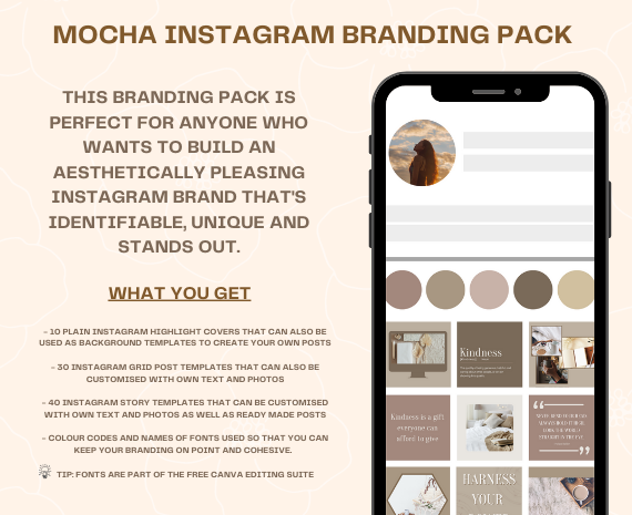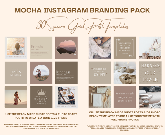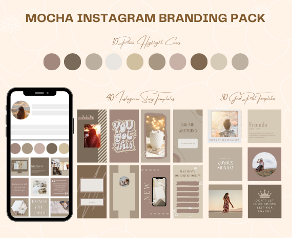 You will get an Instagram branding pack that is on brand and will make your feed stand out! Make your feed unique with this Mocha pack which includes 10 instagram highlight covers, 30 Grid post templates and 40 Story templates.