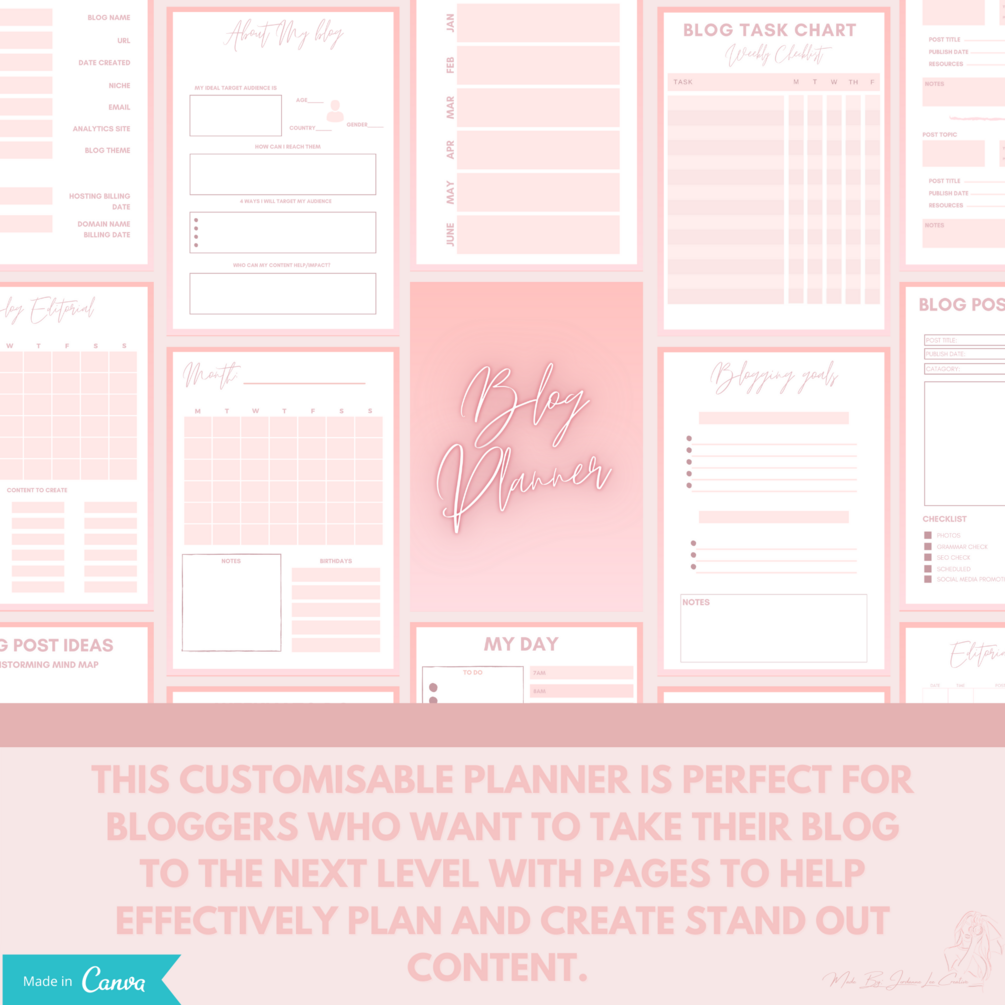 You'll get the fully customisable blog planner template for Canva with 80 unique pages