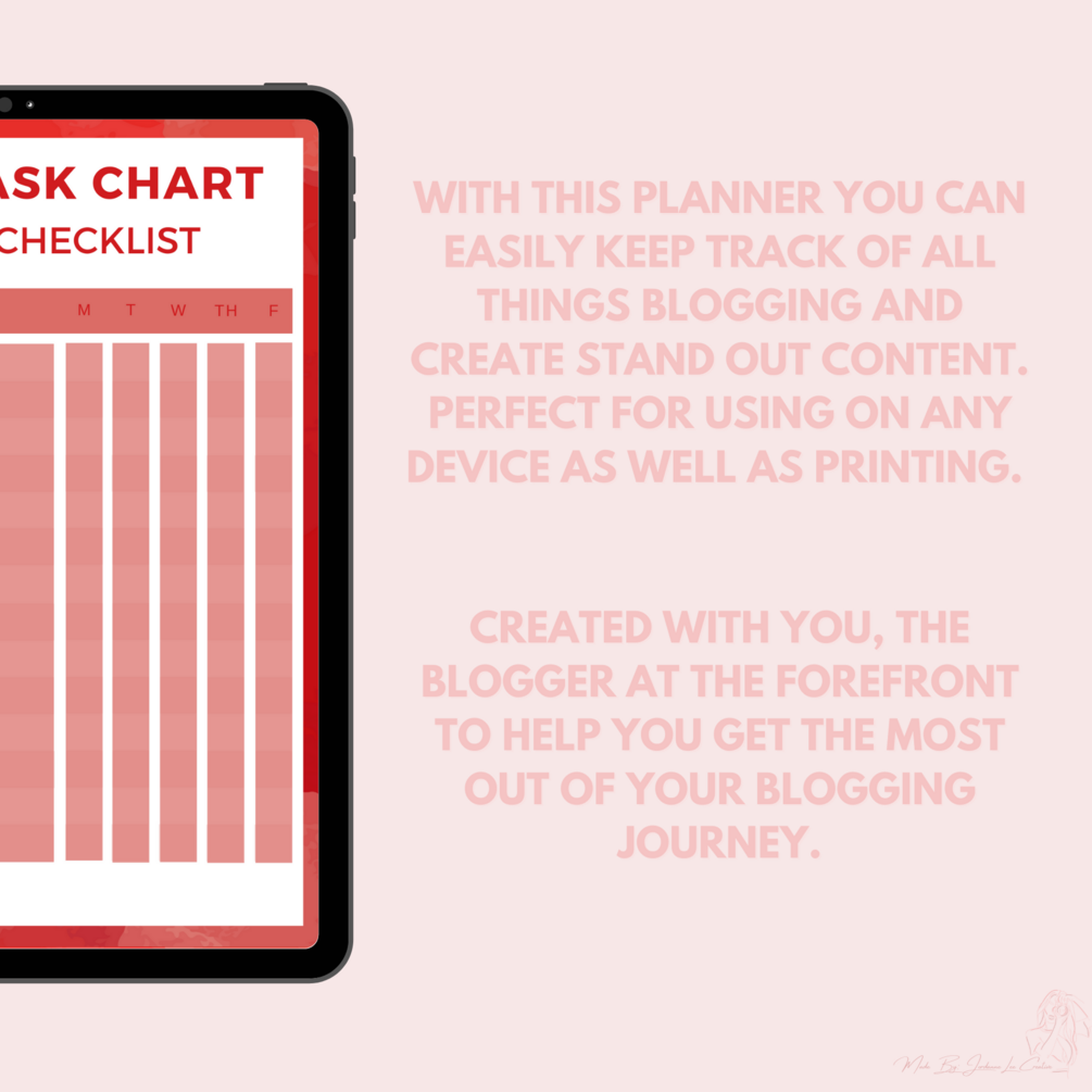 Take charge of your blogging journey today; stay organised with the monthly, weekly and daily sections, optimise your blog post performance with the planning stages section, get your creative juices flowing with a brain storming session and get ready to take your blogging performance to the next level.